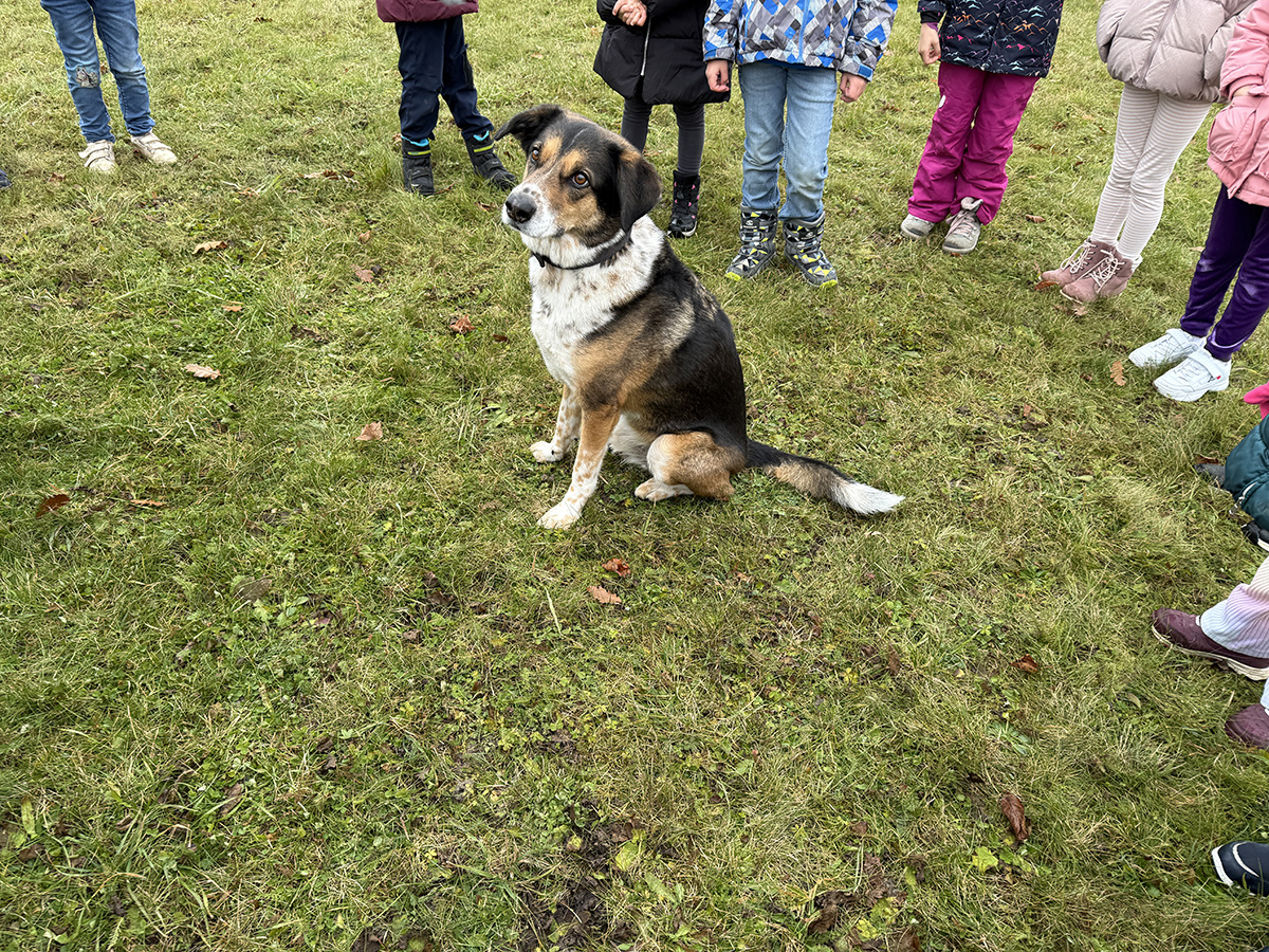 Ein besonderes Erlebnis hatten die ersten Klassen: Gemeinsam mit unserem Schulhund Camino durften die Kinder eine kleine Gassirunde drehen. Dabei erfuhren sie von Dani viele spannende Dinge über den richtigen Umgang mit Hunden.