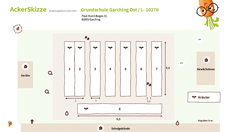 Die AckerSkizze ist eine grobe Zeichnung des Schulgartens. Hier sind Orientierungspunkte zum Ausmessen des Ackers sowie die konkrete Verteilung und Anordnung der Beete abgebildet. Auf der AckerSkizze sehen wir also, wo das jeweilige Beet auf der Fläche liegt.