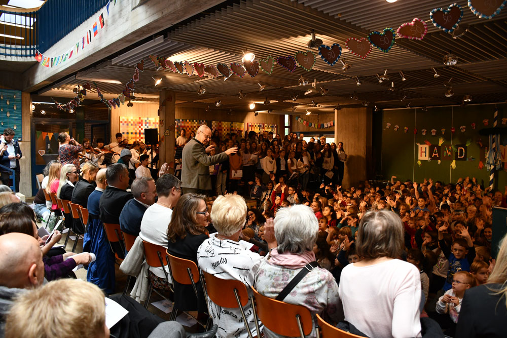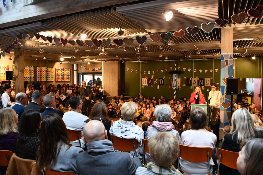 Imposant auch, wie die kleinen Musiker bei einem inklusiven Musikstück, bei dem jedes Kind je nach Leistungsstand seinen Schwierigkeitsgrad selbst wählen konnte, gemeinsam harmonierten und die Aufforderung aussprachen: „Schau den Menschen nur in ihre Augen“. Beim Lied „Hand in Hand“ brachten Chor und Schulrochester das Motto der Schulfamilie treffend zum Ausdruck.