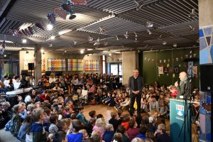 Mit diesen Worten, die auch Grundlage für das Jubiläumslied war, das aus gut 300 Kinderkehlen zur Begrüßung erklang, hieß der Schulleiter der Ost-Grundschule, Edgar Mayer die vielen Gäste, die anlässlich des Schuljubiläums den Weg in die Aula gefunden hatten, willkommen: viele ehemalige Kolleginnen, Weggefährten, die SchulleiterInnen der benachbarten Schulen, MitarbeiterInnen der Stadt, KiTas und Mittagbetreuungen, ebenso Kreisjugendring, Träger der Jugendsozialarbeit als auch aller außerschulischen Partner.